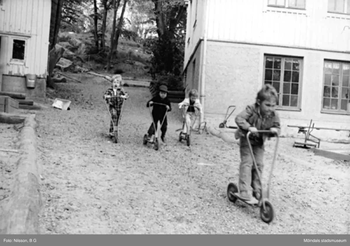Barn på sparkcyklar. Holtermanska daghemmet juni 1974.