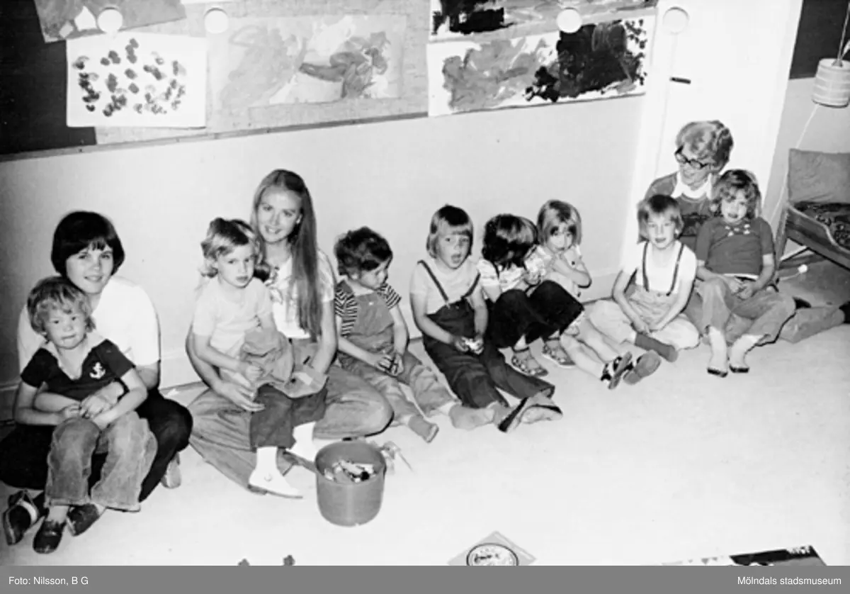 Barn och fröknar sitter på golvet längs väggen på Holtermanska daghemmet, maj 1975.