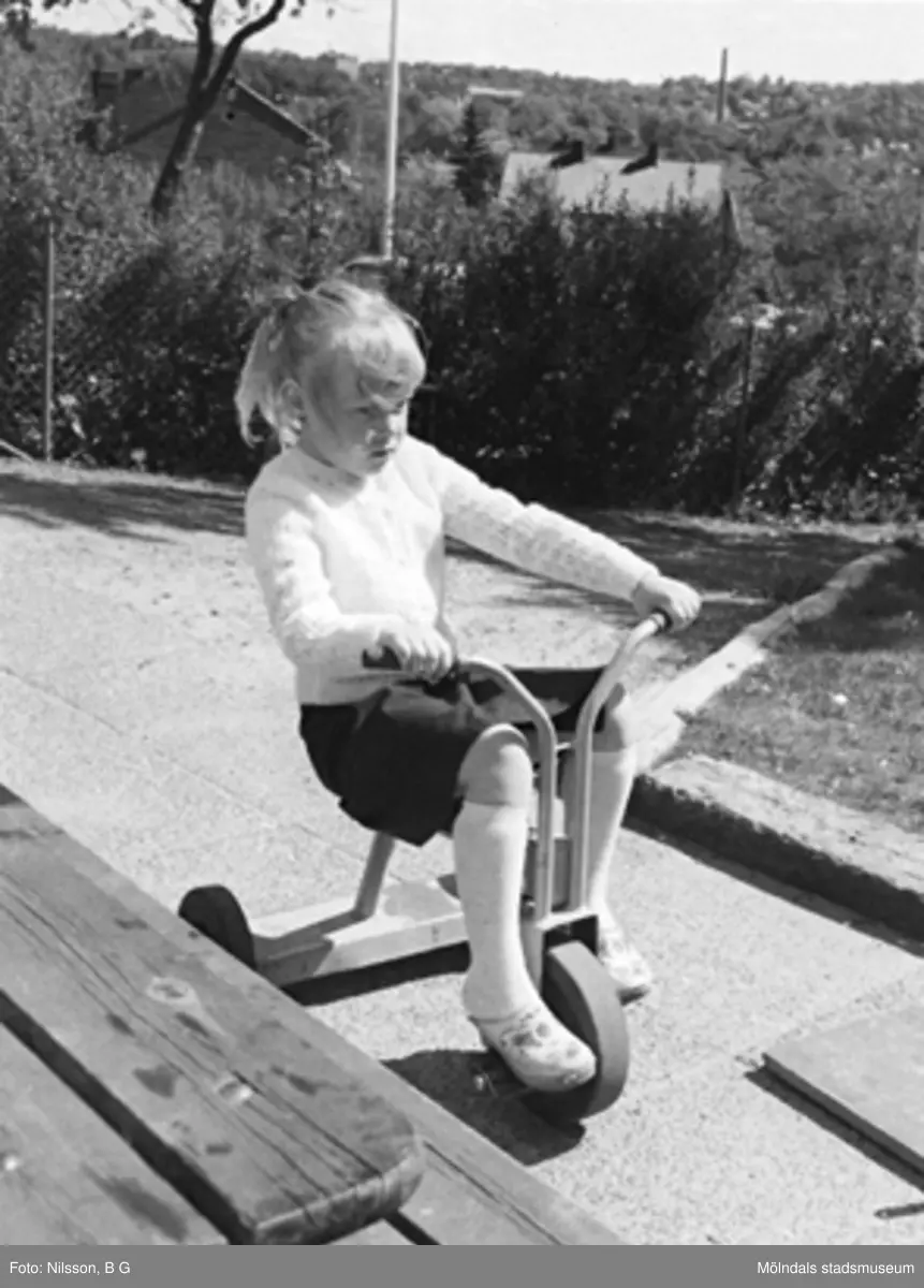 En flicka som cyklar på en trehjuling. Holtermanska daghemmet, okänt årtal.
