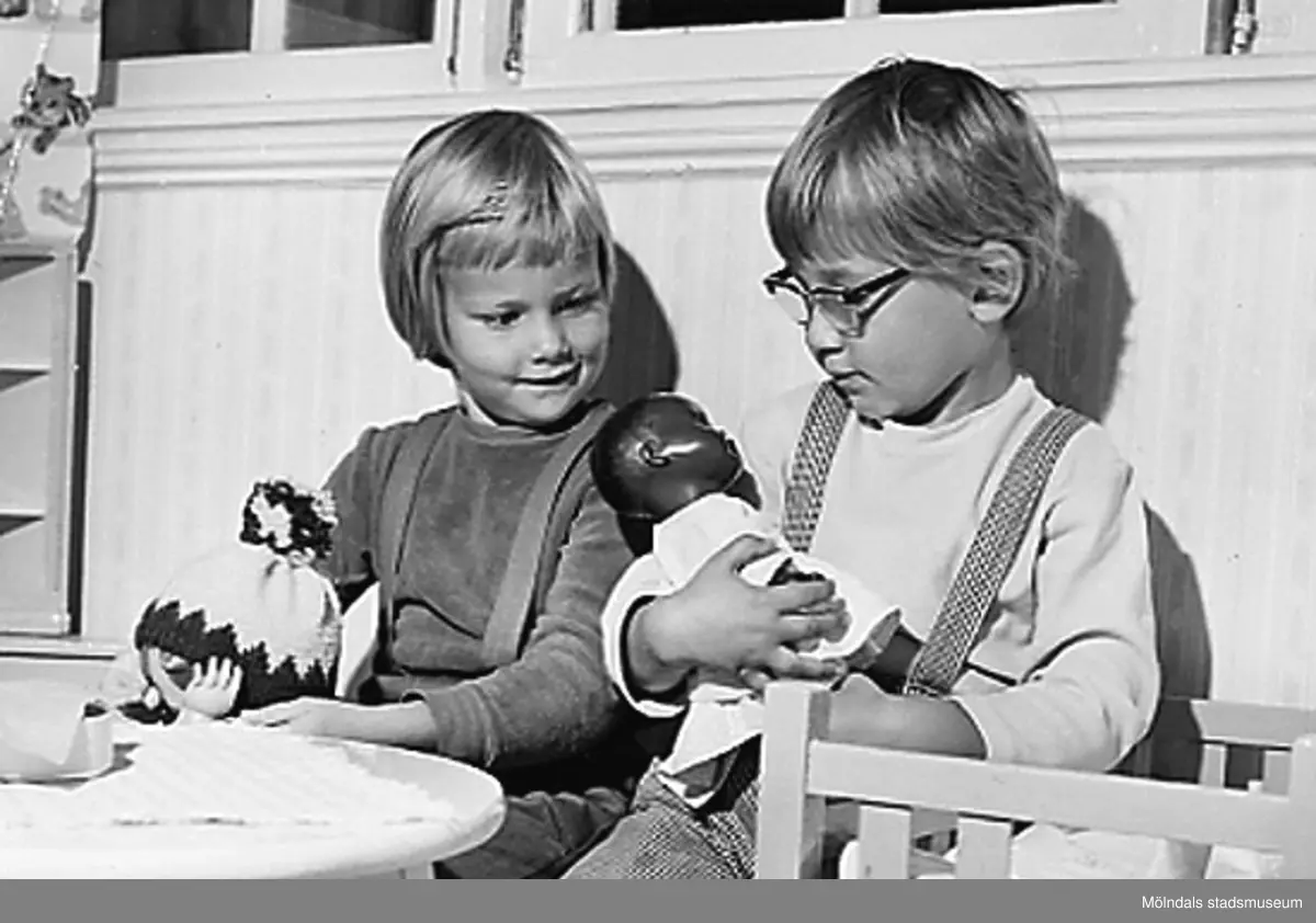 Två barn med dockor i famnen. Holtermanska daghemmet 1953.