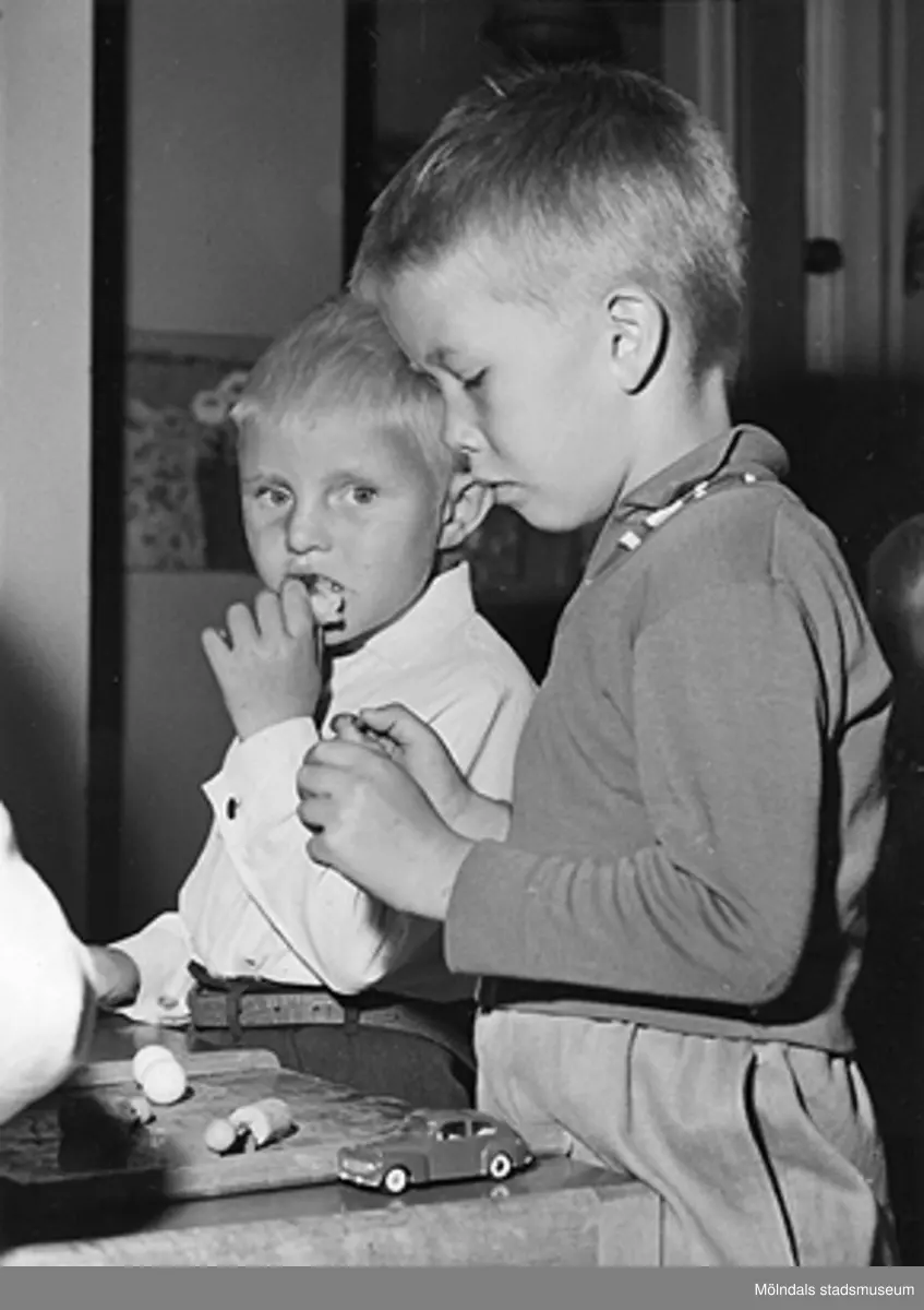 Två pojkar som leker med bilar. Holtermanska daghemmet 1953.