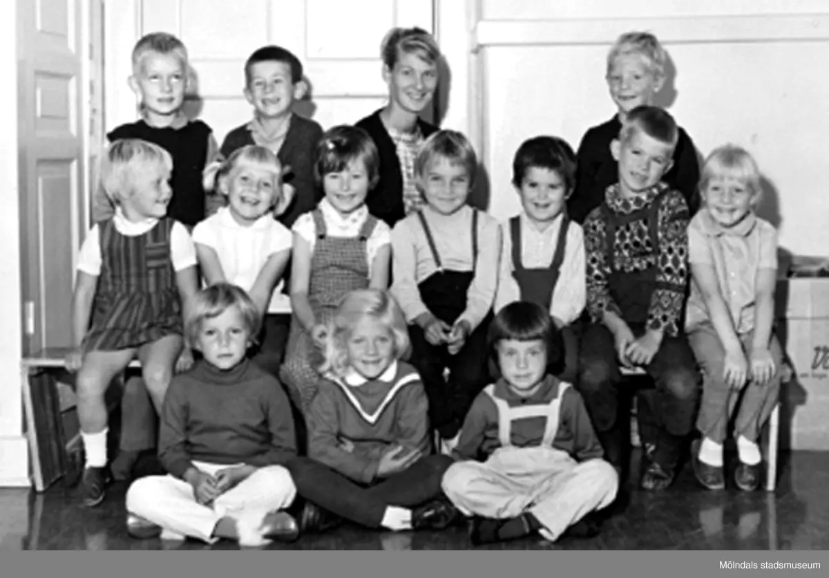 Grupporträtt på lärarinnan och alla barnen vid Holtermanska daghemmet 1953.