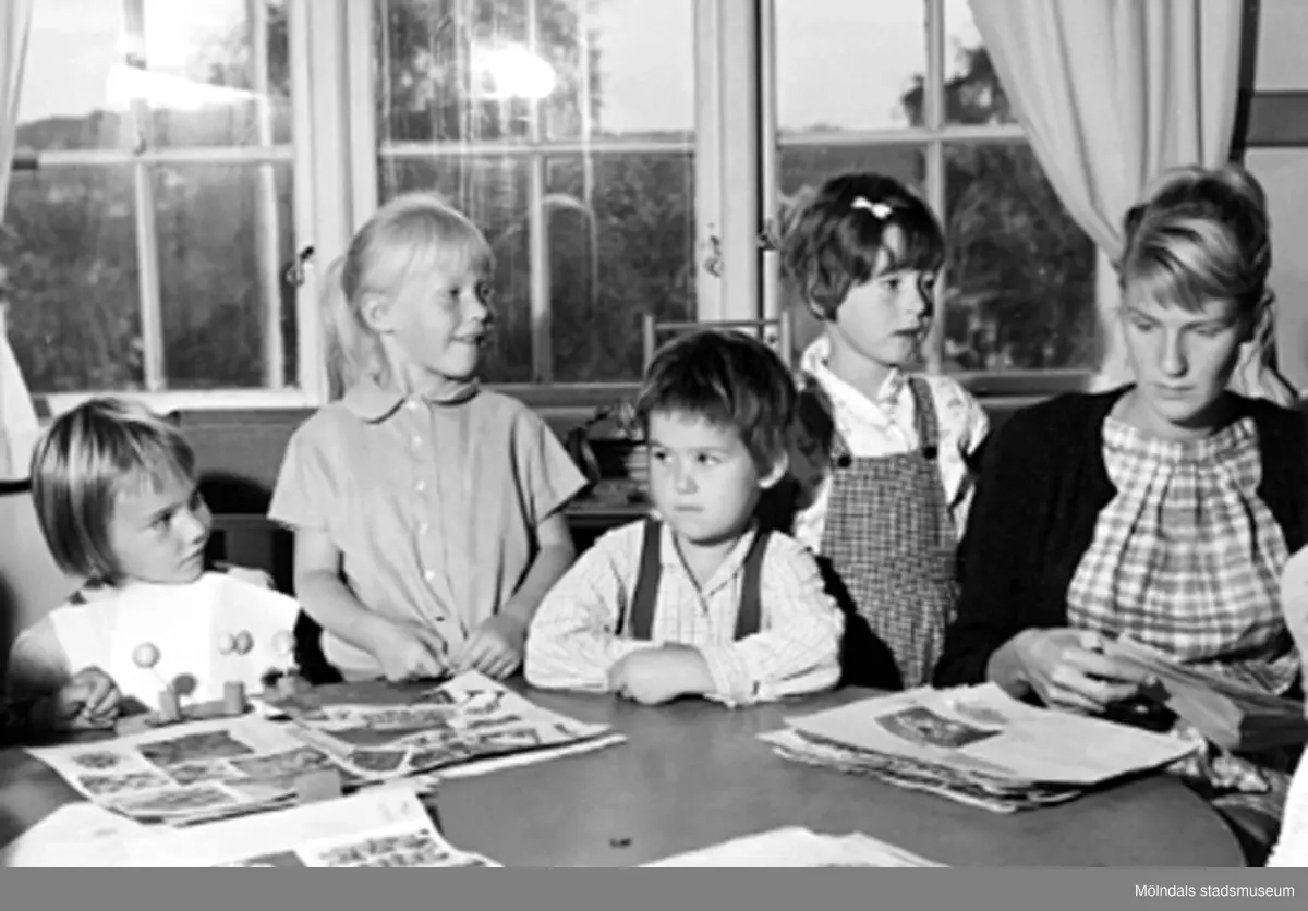 Lärarinna och dagbarn pysslar vid ett bord. Holtermanska daghemmet 1953.