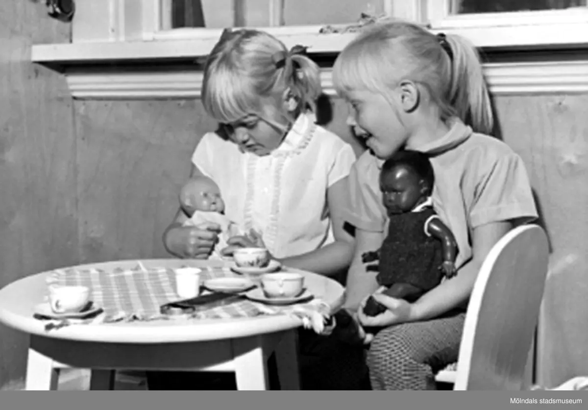 Två flickor med var sin docka i famnen. Holtermanska daghemmet 1953.