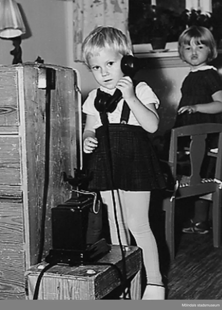 En flicka håller en svart telefonlur av bakelit i handen. Framför henne står tillhörande "gammaldags" telefonapparat. Holtermanska daghemmet 1953.