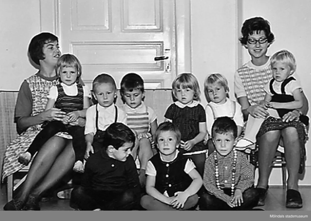 Grupporträtt av barn och två lärarinnor vid Holtermanska daghemmet 1953.