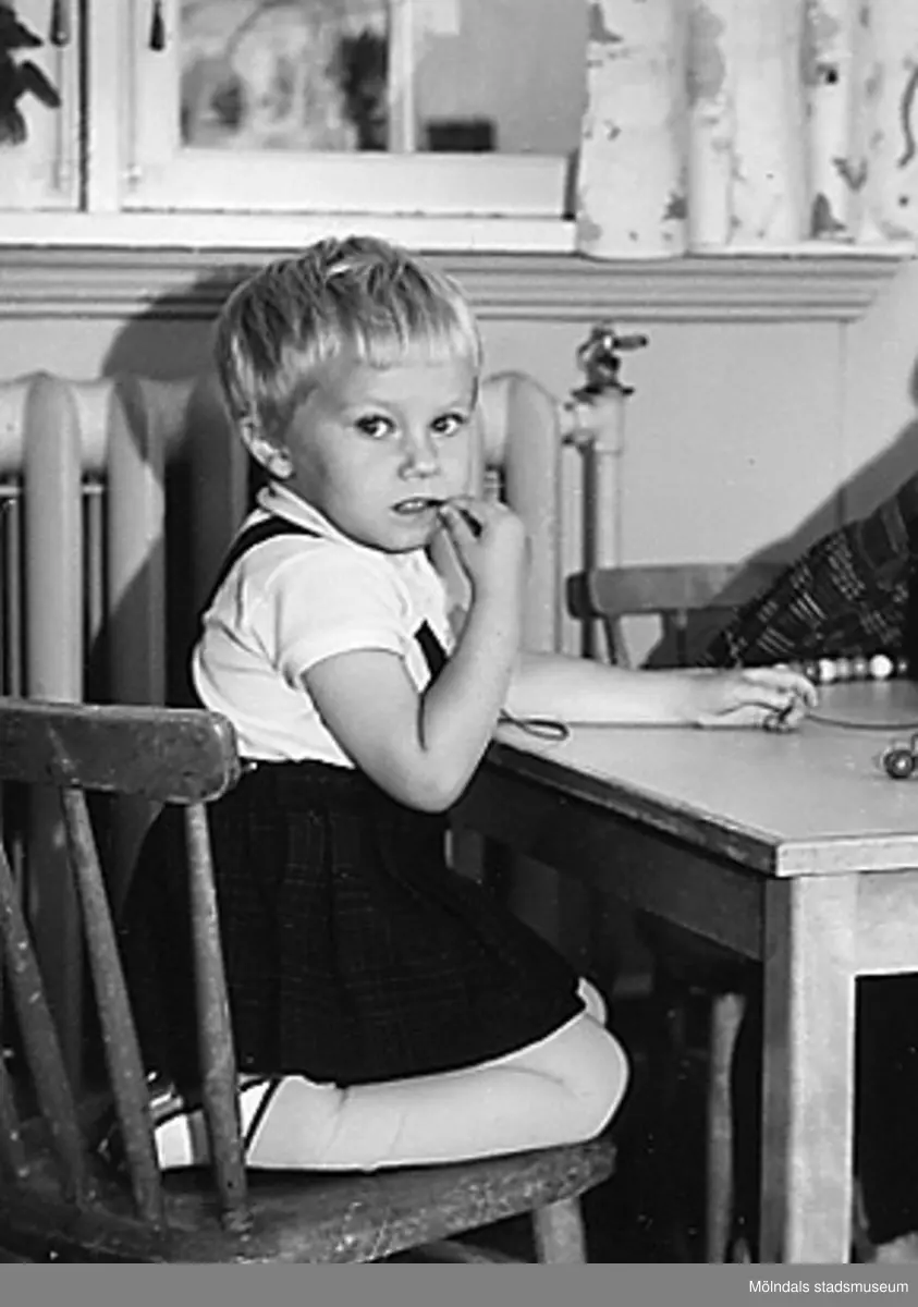 En flicka som sitter vid ett bord. Holtermanska daghemmet 1953.