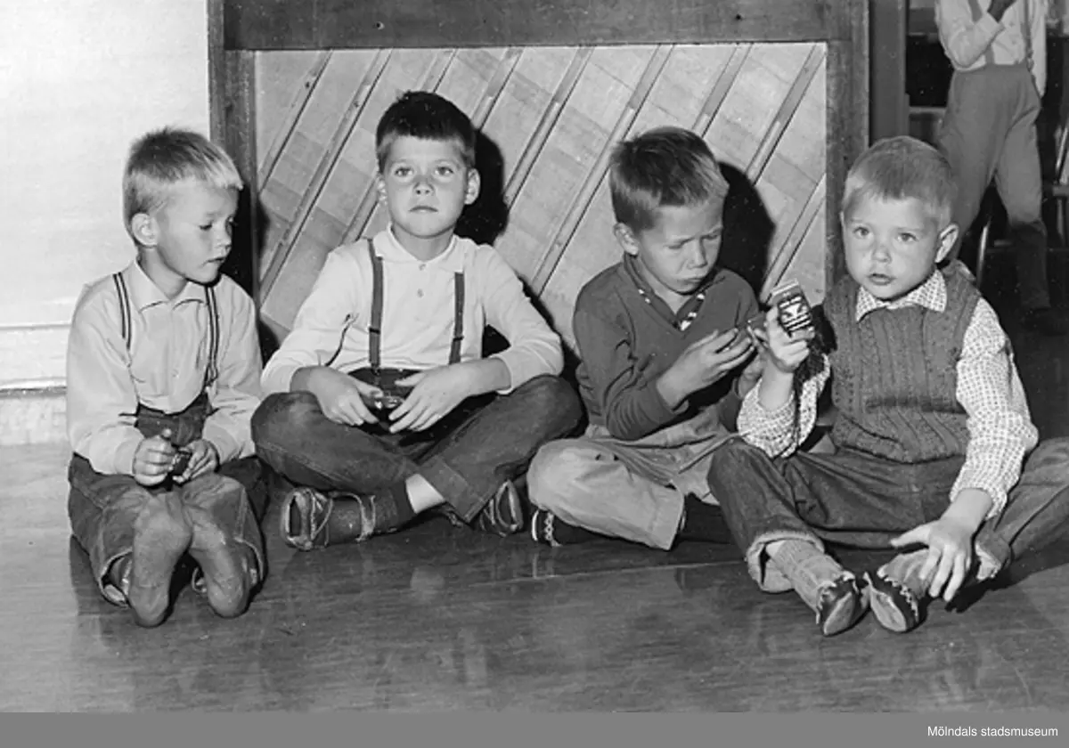 Fyra pojkar som sitter på golvet vid Holtermanska daghemmet 1953.