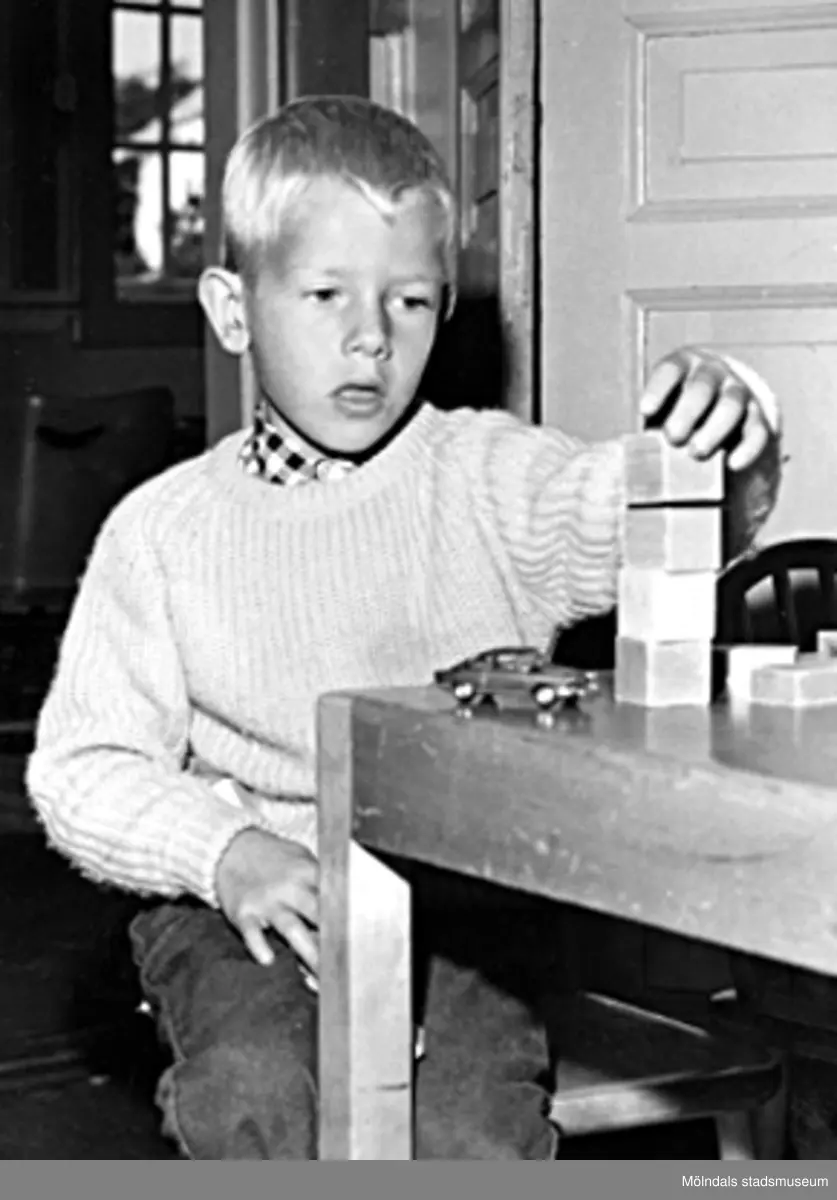 En pojke som leker med byggklossar och bil. Holtermanska daghemmet 1953.