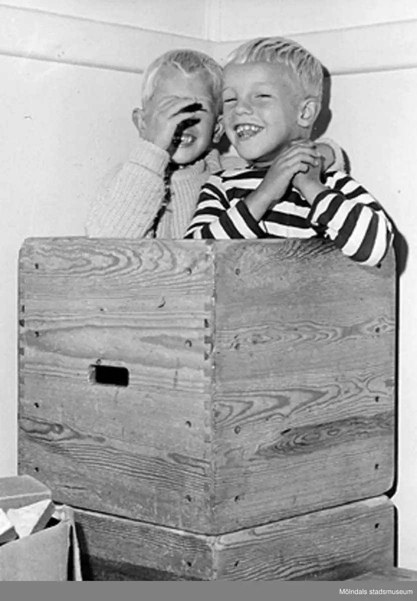 Två pojkar leker i stapelbara trälådor. Holtermanska daghemmet 1953.