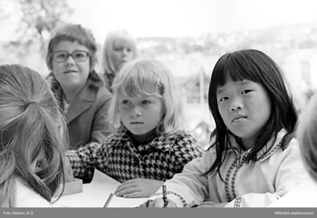 Några barn sitter utomhus och ritar. Holtermanska daghemmet juni 1973.