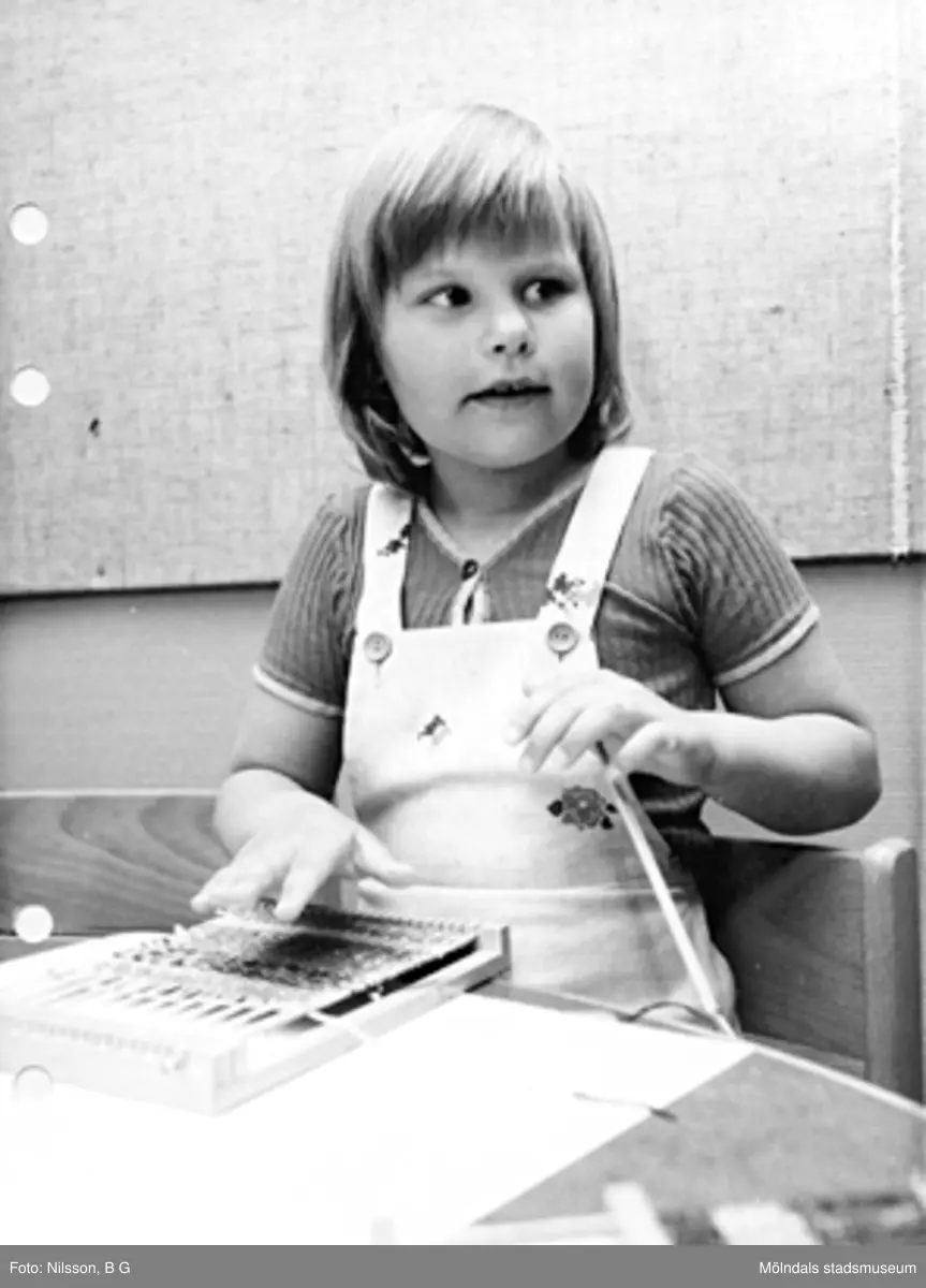 Ett barn som väver. Holtermanska daghemmet maj 1975.