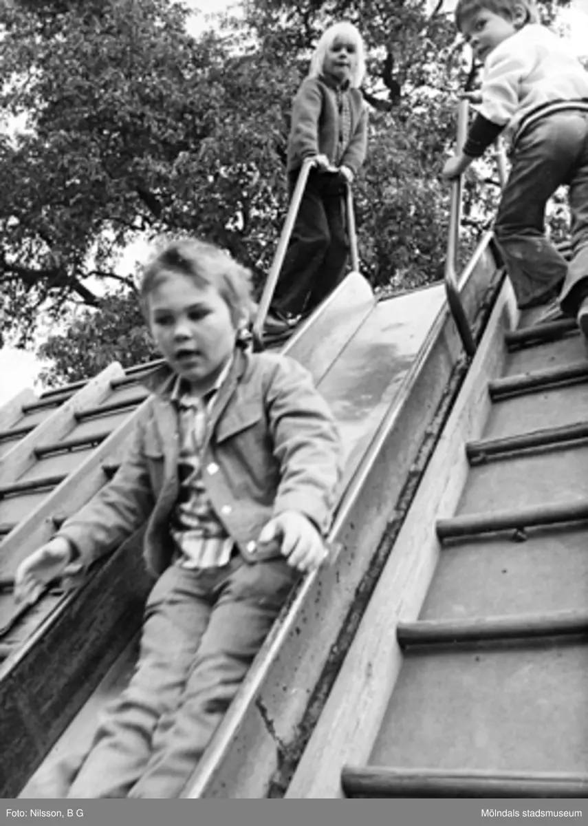 Barn som leker i rutschbana. Holtermanska daghemmet juni 1974.