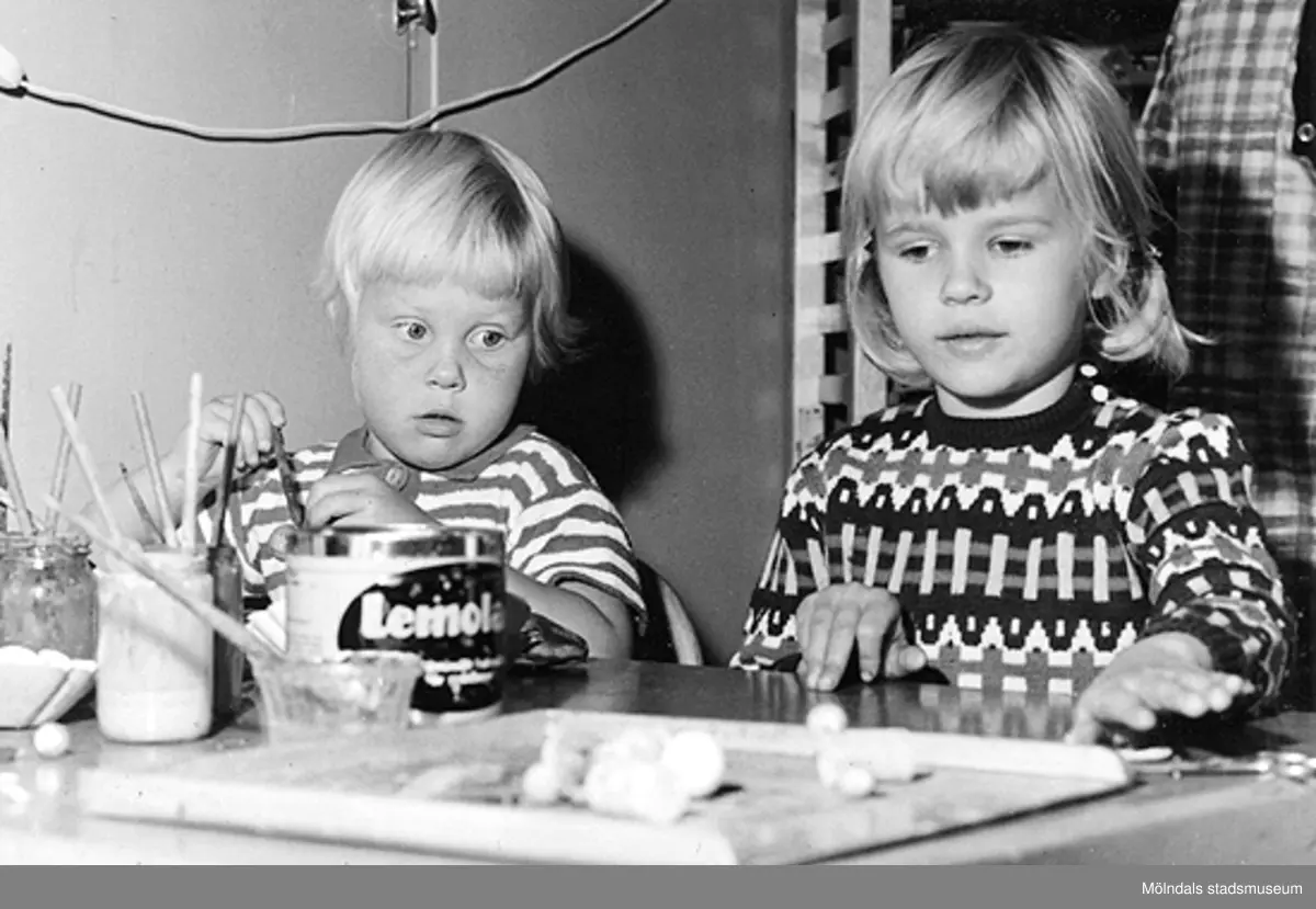 Två barn sitter vid ett bord och pysslar. Holtermanska daghemmet 1953.