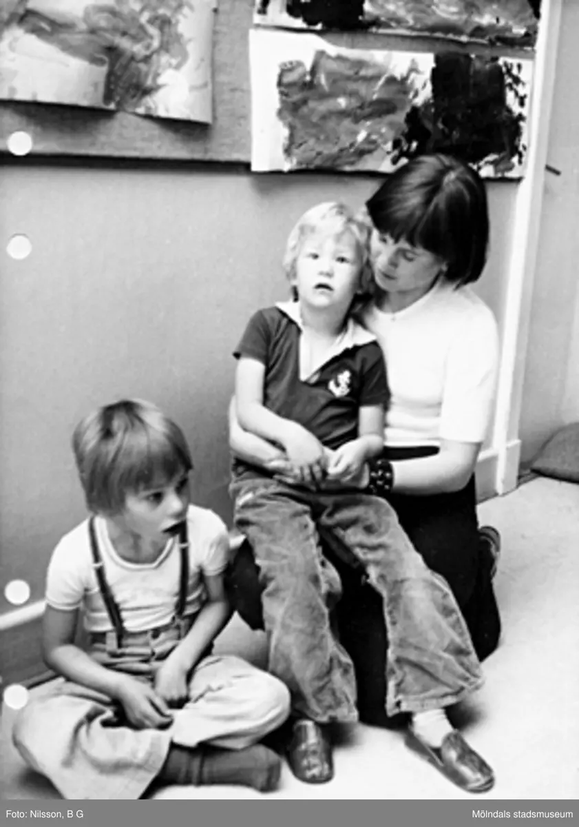 Två barn och en fröken sitter på golvet. Holtermanska daghemmet maj 1975.