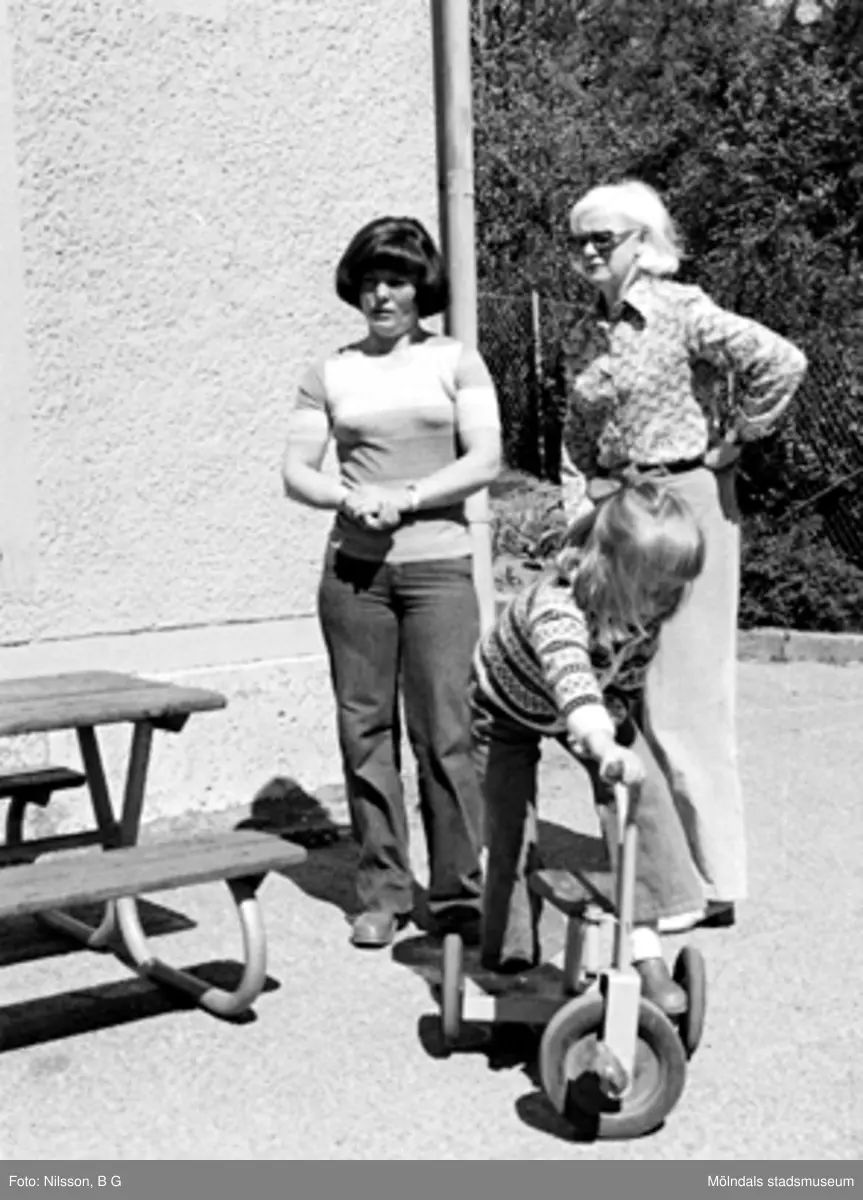 Ett barn på en cykel och två fröknar. Holtermanska daghemmet, okänt årtal.