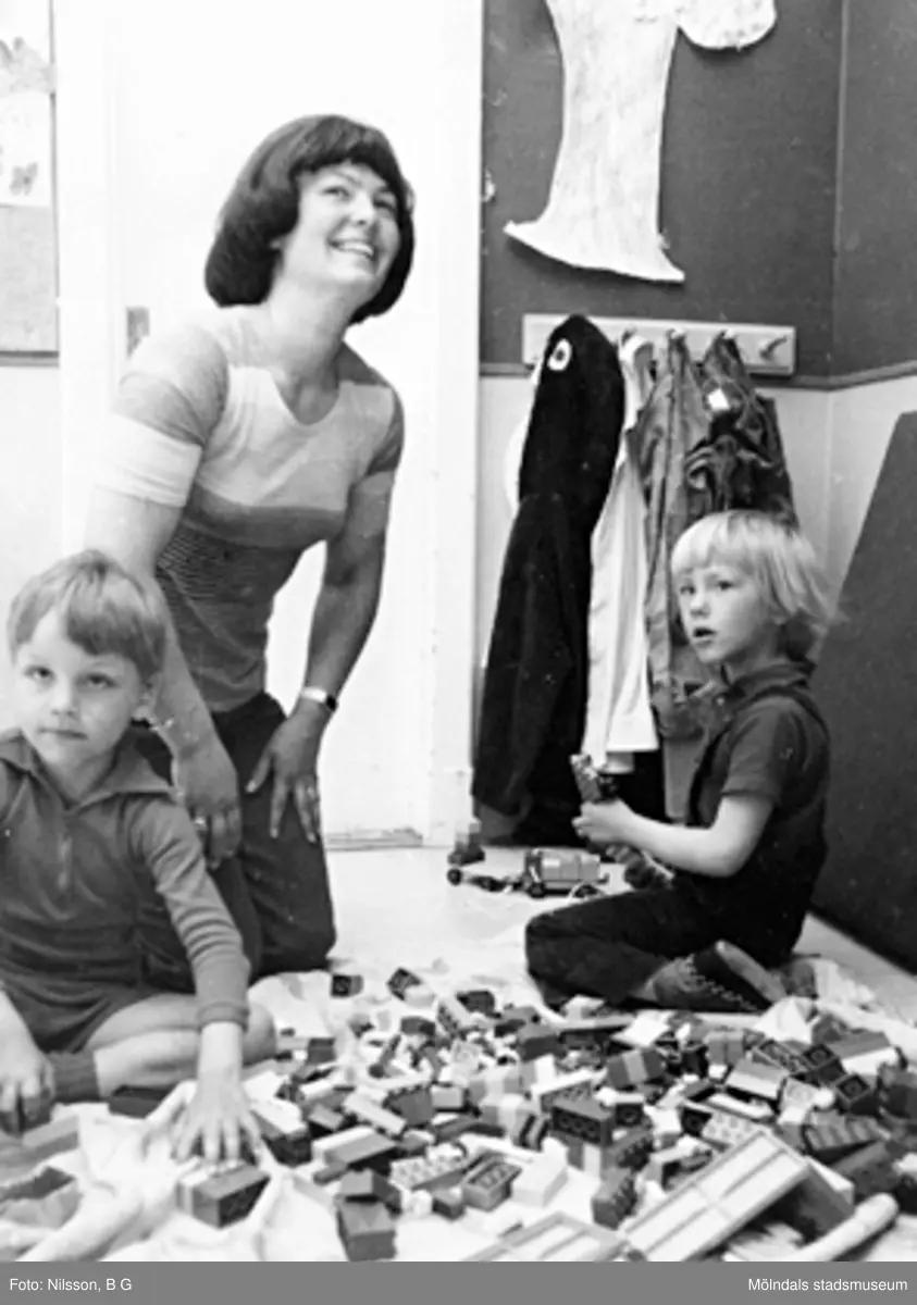 Två pojkar och en fröken som sitter på golvet och leker. Holtermanska daghemmet, okänt årtal.