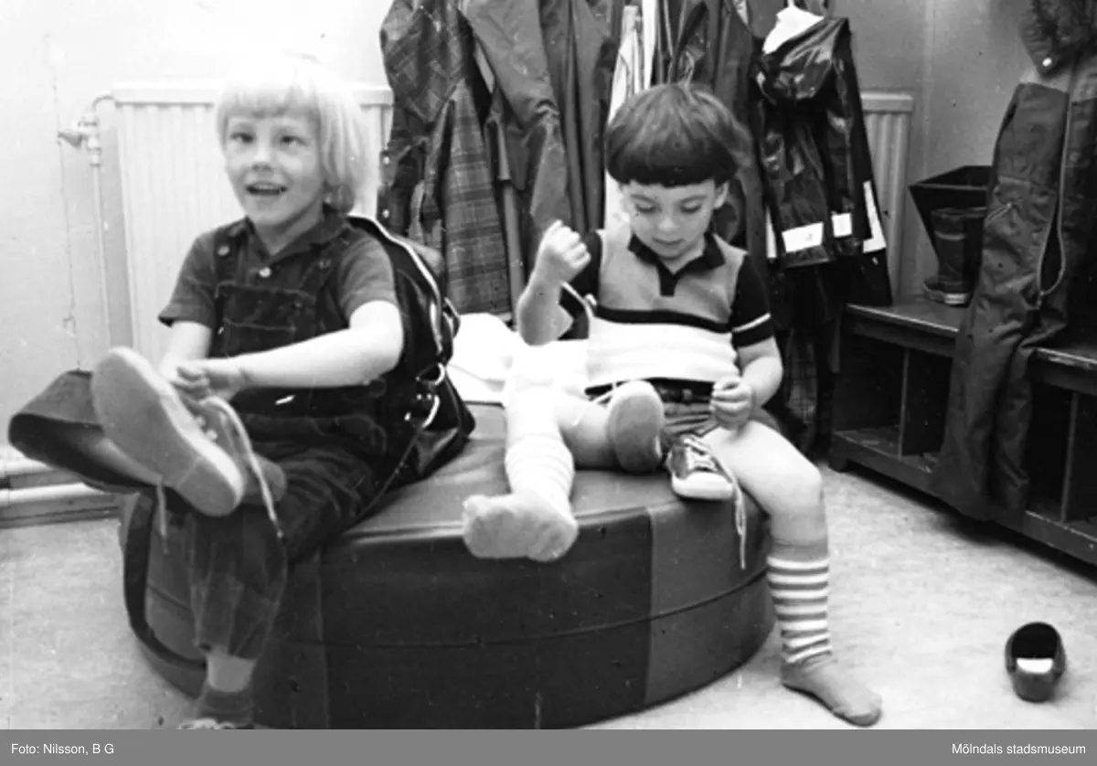 Två pojkar som tar på sig skor. Holtermanska daghemmet, okänt årtal.