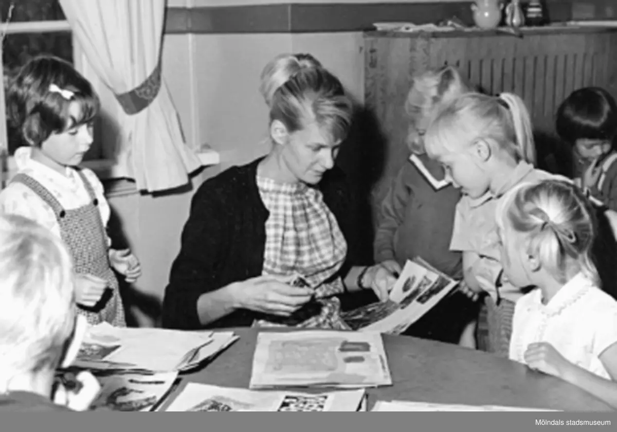 En lärarinna och några barn pysslar vid ett bord. Holtermanska daghemmet 1953.