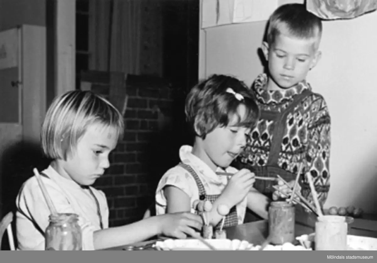Tre barn som pysslar vid ett bord. Holtermanska daghemmet 1953.