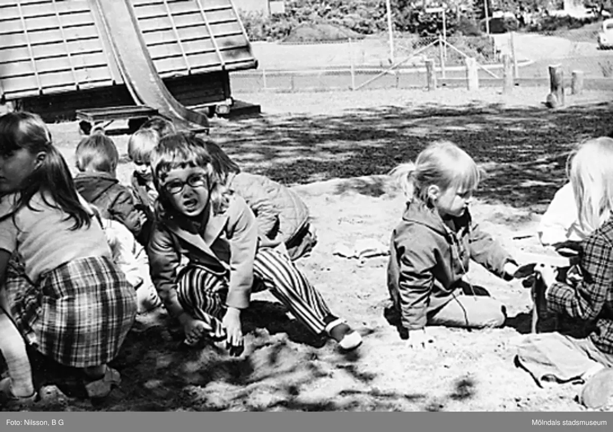 Dagisbarn som leker utomhus i en sandlåda vid Holtermanska daghemmet juni 1973.