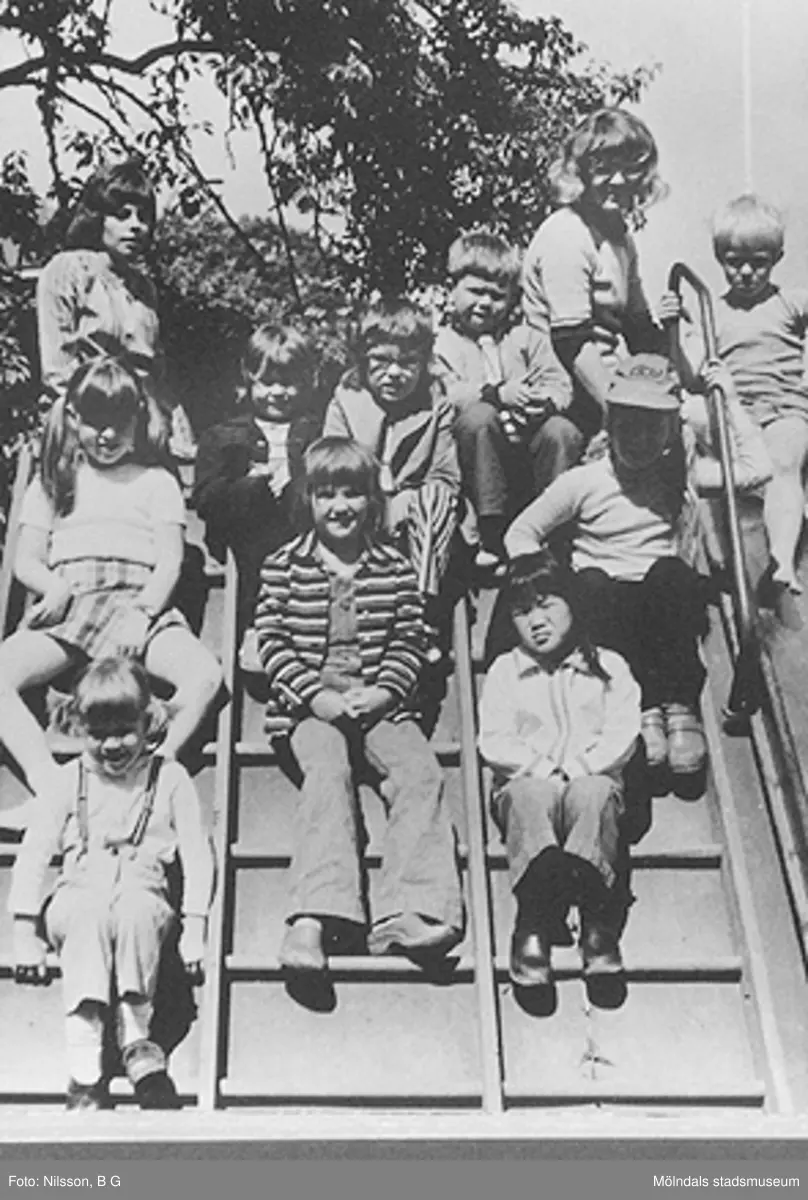 En grupp barn och två fröknar på klätterställning. Holtermanska daghemmet juni 1973.