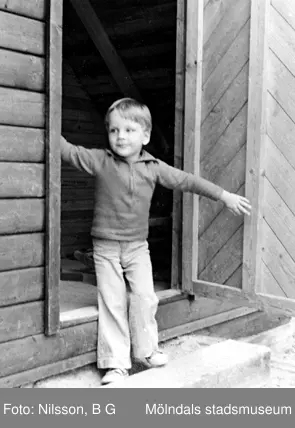 En pojke som står i ingången till ett förrådshus. Holtermanska daghemmet 1973.