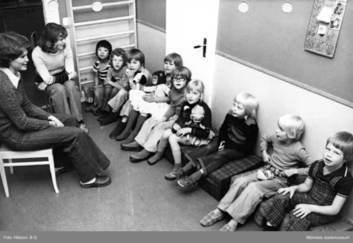 Barn som sitter på en bänk vid en vägg och två fröknar som sitter i var sin stol mittemot barnen. Holtermanska daghemmet maj 1975.