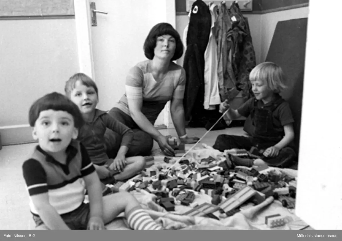 Tre barn och en fröken som sitter på golvet och leker. Holtermanska daghemmet, okänt årtal.
