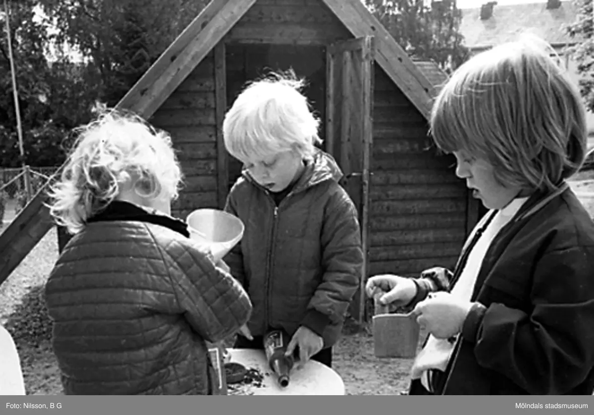 Tre lekande barn i sandlådan. Holtermanska daghemmet juni 1974.