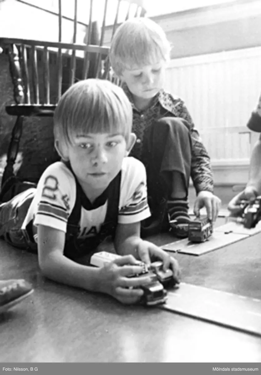 Två pojkar som leker med bilar. Holtermanska daghemmet, okänt årtal.
