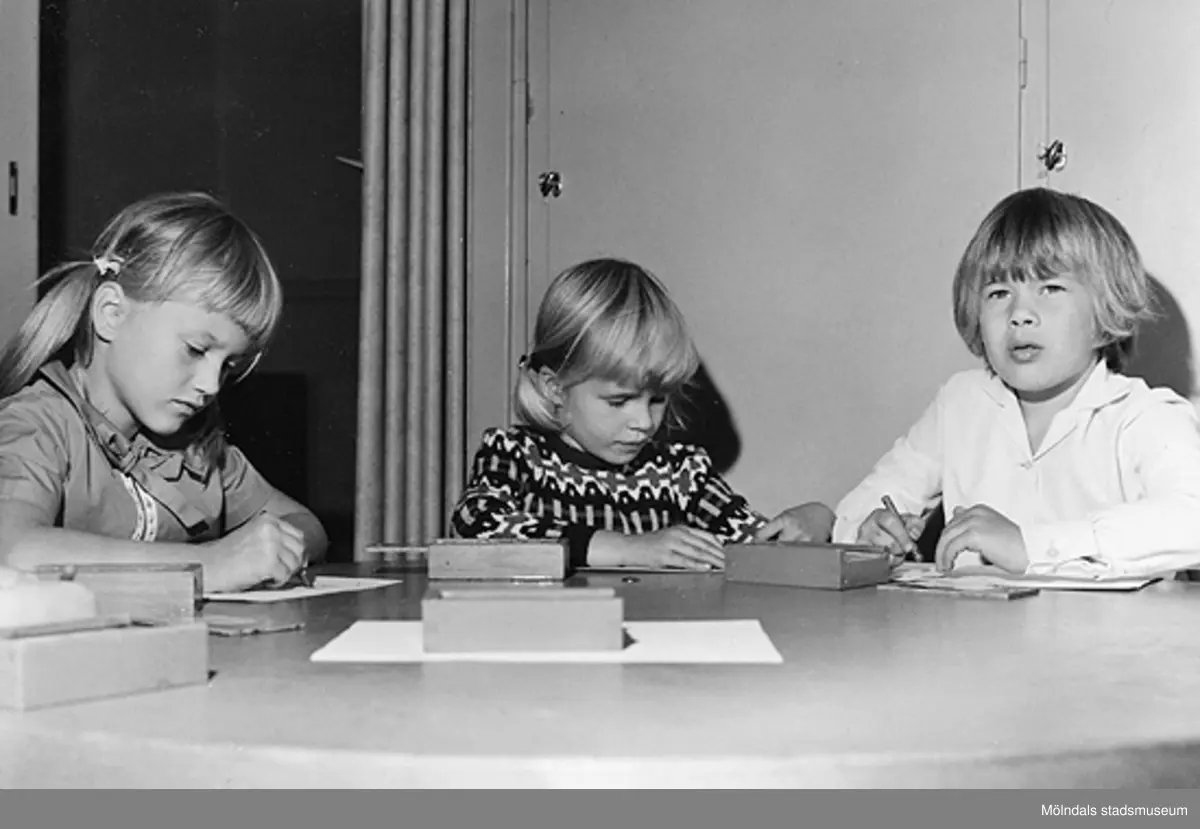 Tre barn som ritar vid ett bord. Holtermanska daghemmet 1953.
