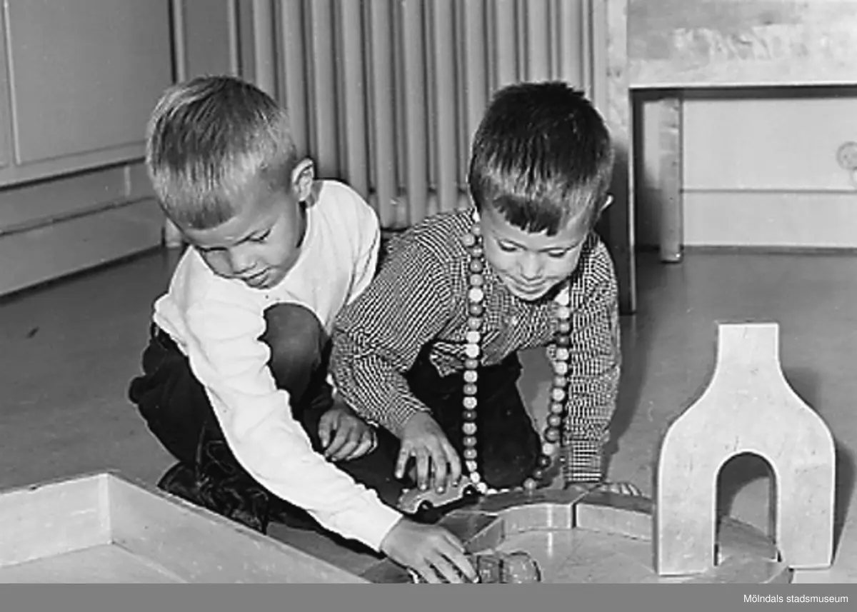 Titel: Två pojkar leker med byggklossar på golvet vid Holtermanska daghemmet 1953.