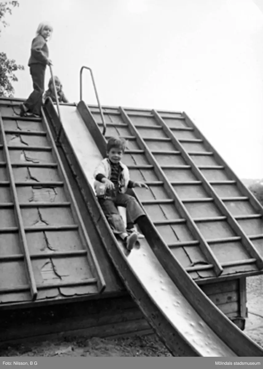 Barn som åker rutschbana. Holtermanska daghemmet juni 1974.