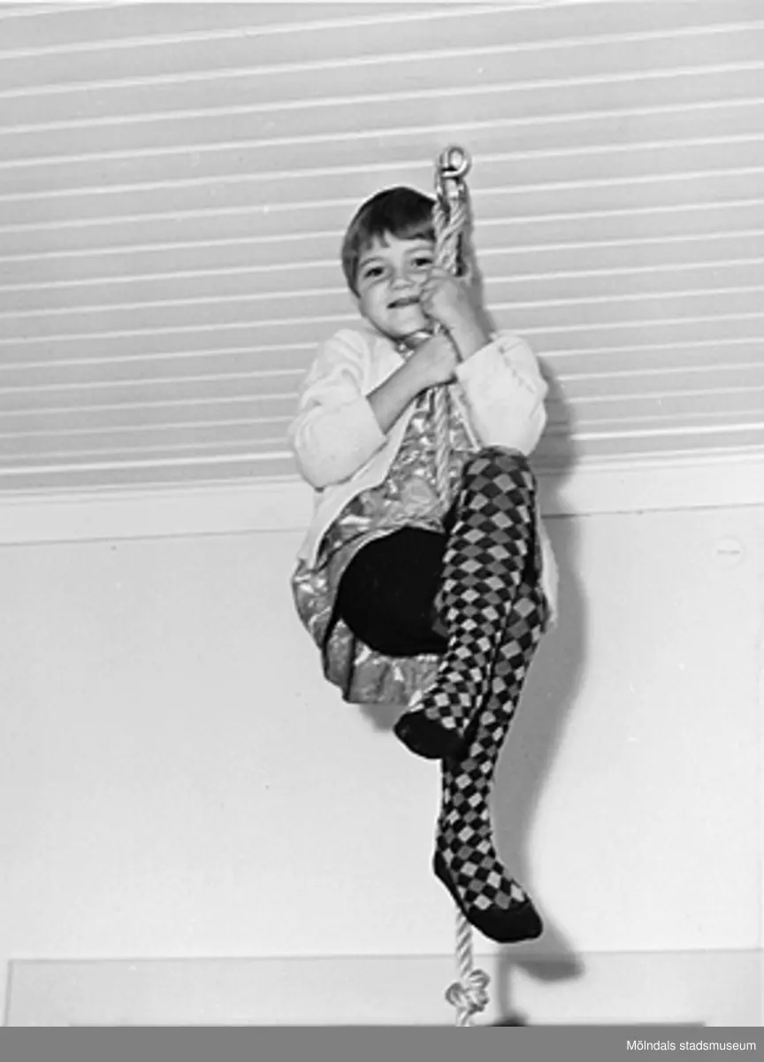 En flicka uppklättrad i ett rep nära taket vid Holtermanska daghemmet 1953.