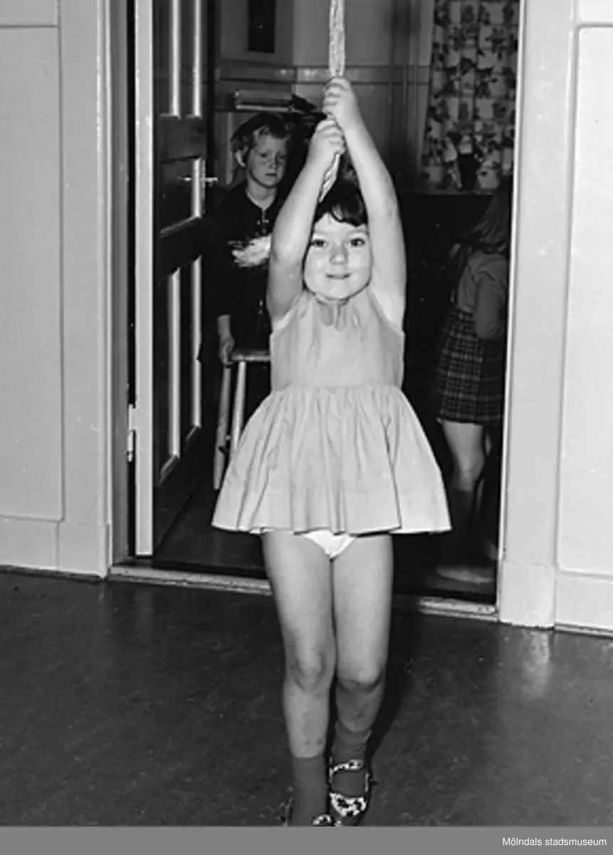 En flicka hänger i ett rep som hänger från taket vid Holtermanska daghemmet 1953.