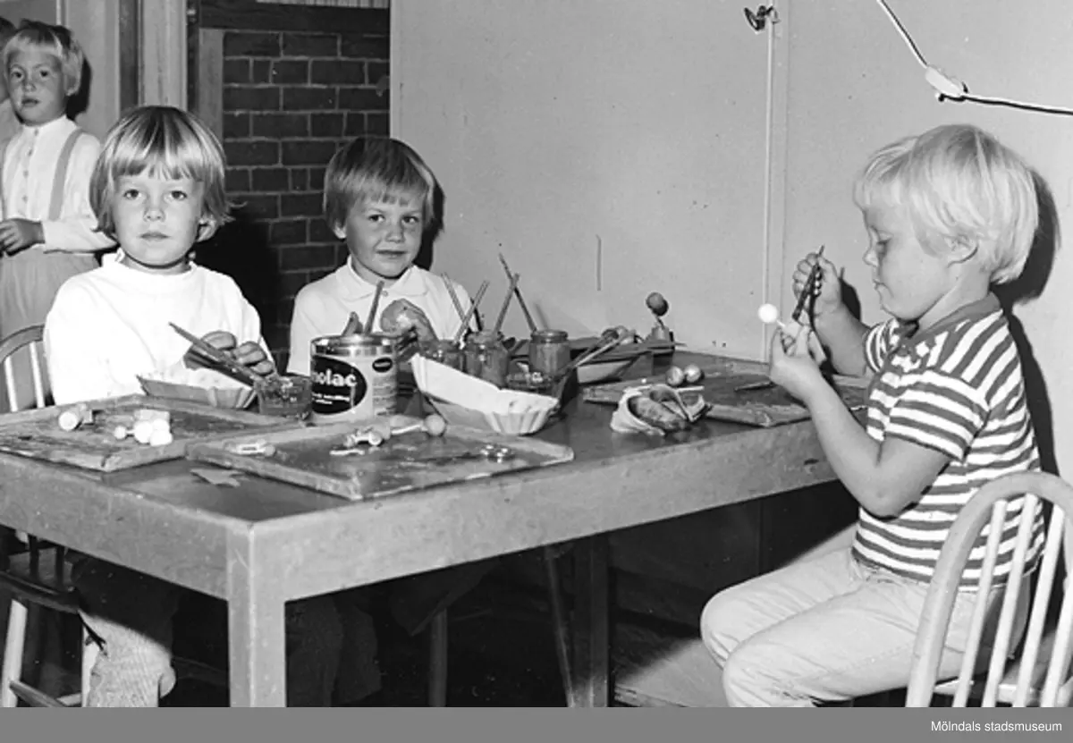 Några barn sitter och målar vid ett bord. Holtermanska daghemmet 1953.
