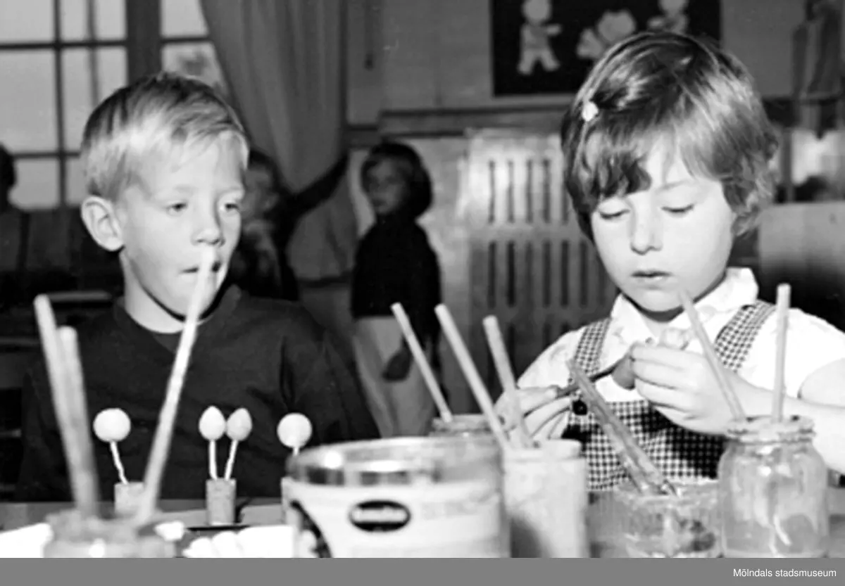 Två barn sitter vid ett bord och pysslar. Holtermanska daghemmet 1953.