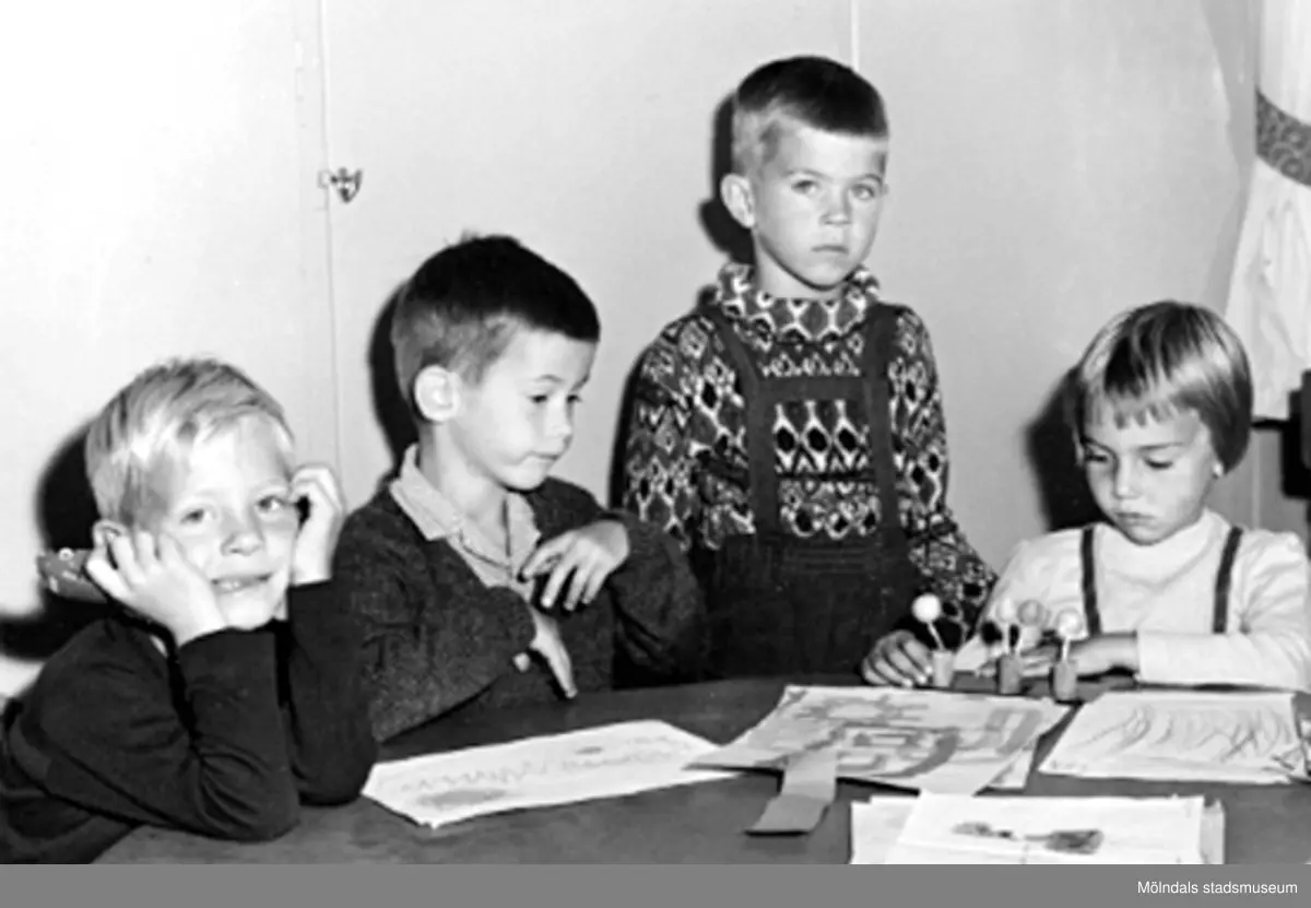 Fyra barn som sitter vid ett bord där det ligger målade teckningar. Holtermanska daghemmet 1953.