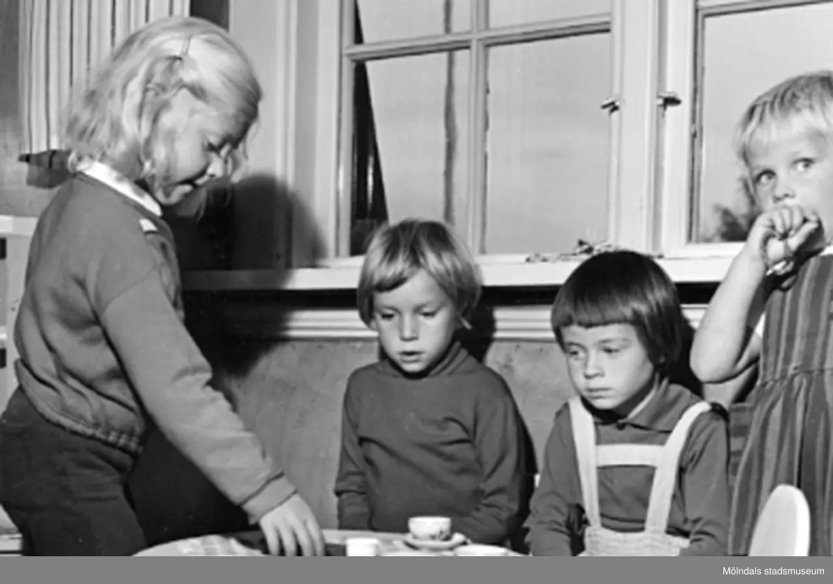 Fyra barn som har "kafferep" vid ett bord. Holtermanska daghemmet 1953.