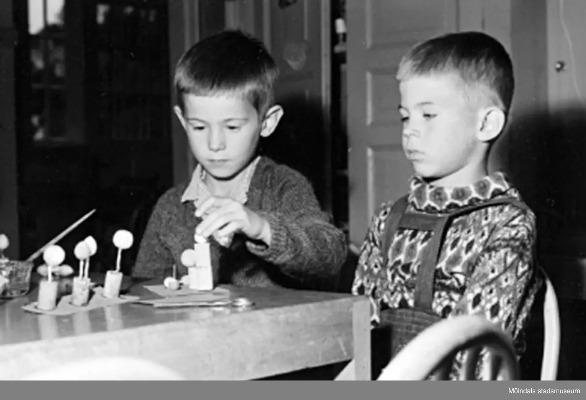 Två pojkar pysslar vid ett bord. Holtermanska daghemmet 1953.