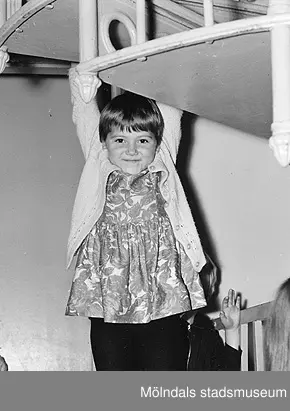 En flicka håller hängande i trappan vid Holtermanska daghemmet 1953.