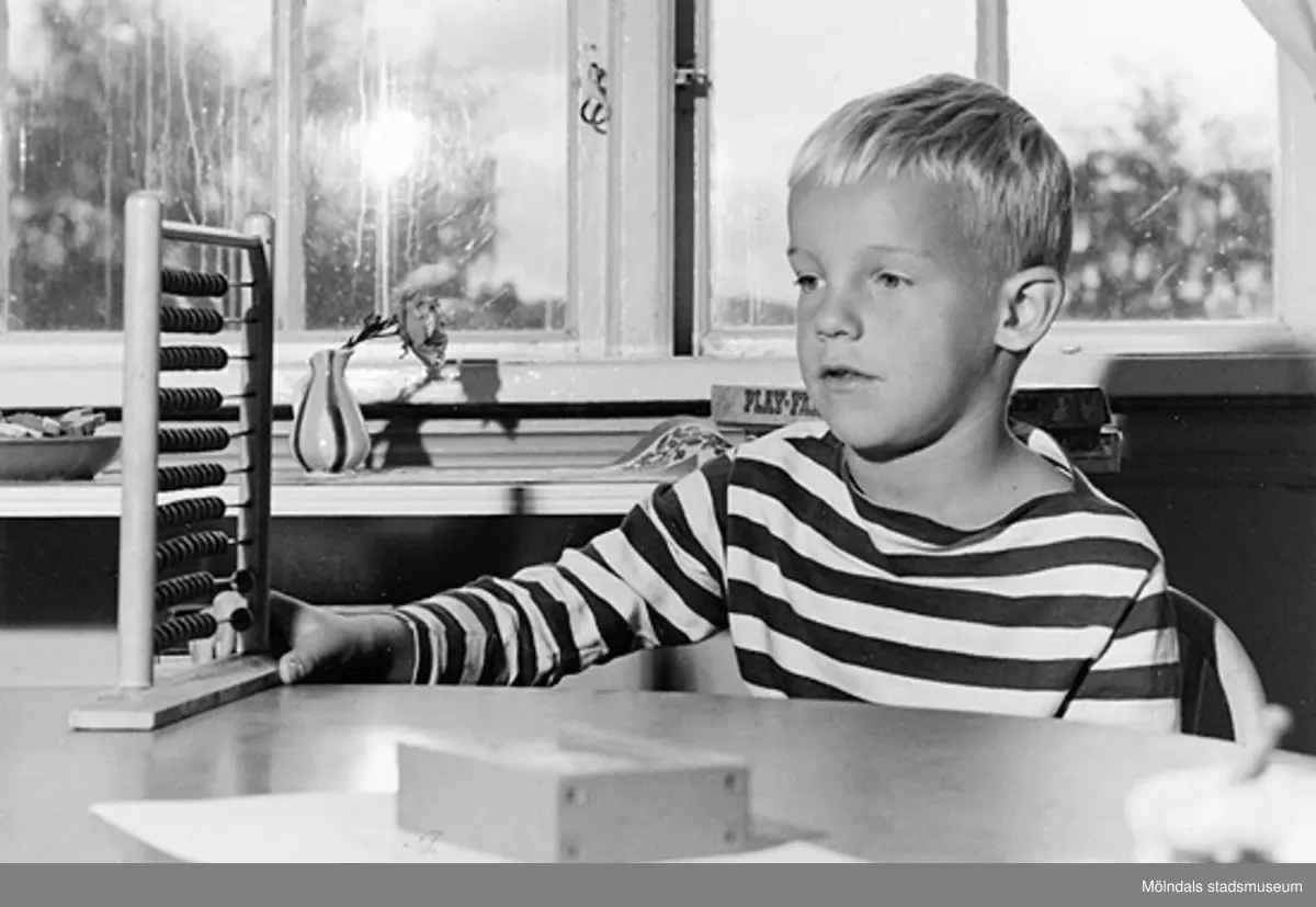 En pojke sitter vid ett bord där det står en kulram. Holtermanska daghemmet 1953.