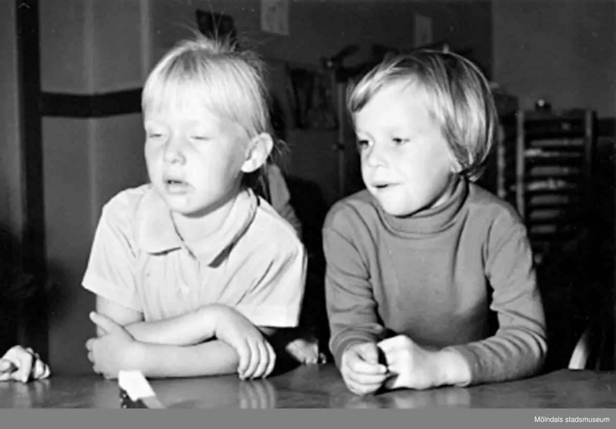 Två flickor som sitter vid ett bord. Bilden är något överexponerad. Holtermanska daghemmet 1953.