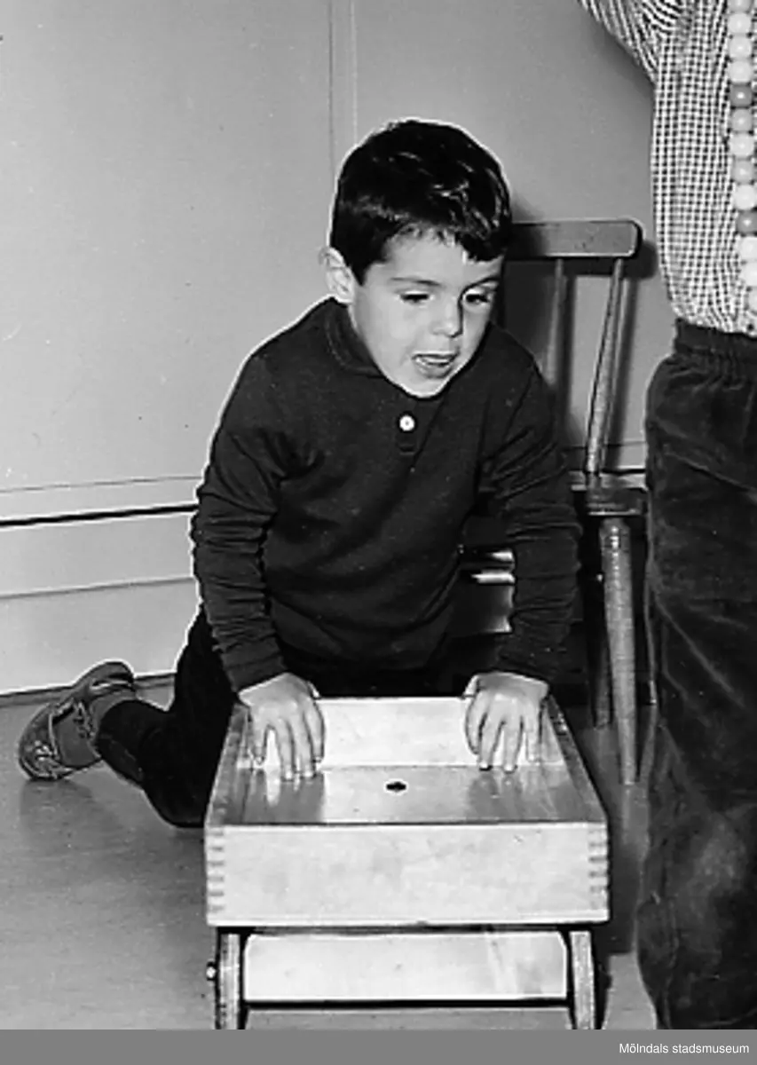En pojke skjuter en liten trävagn framför sig vid Holtermanska daghemmet 1953.