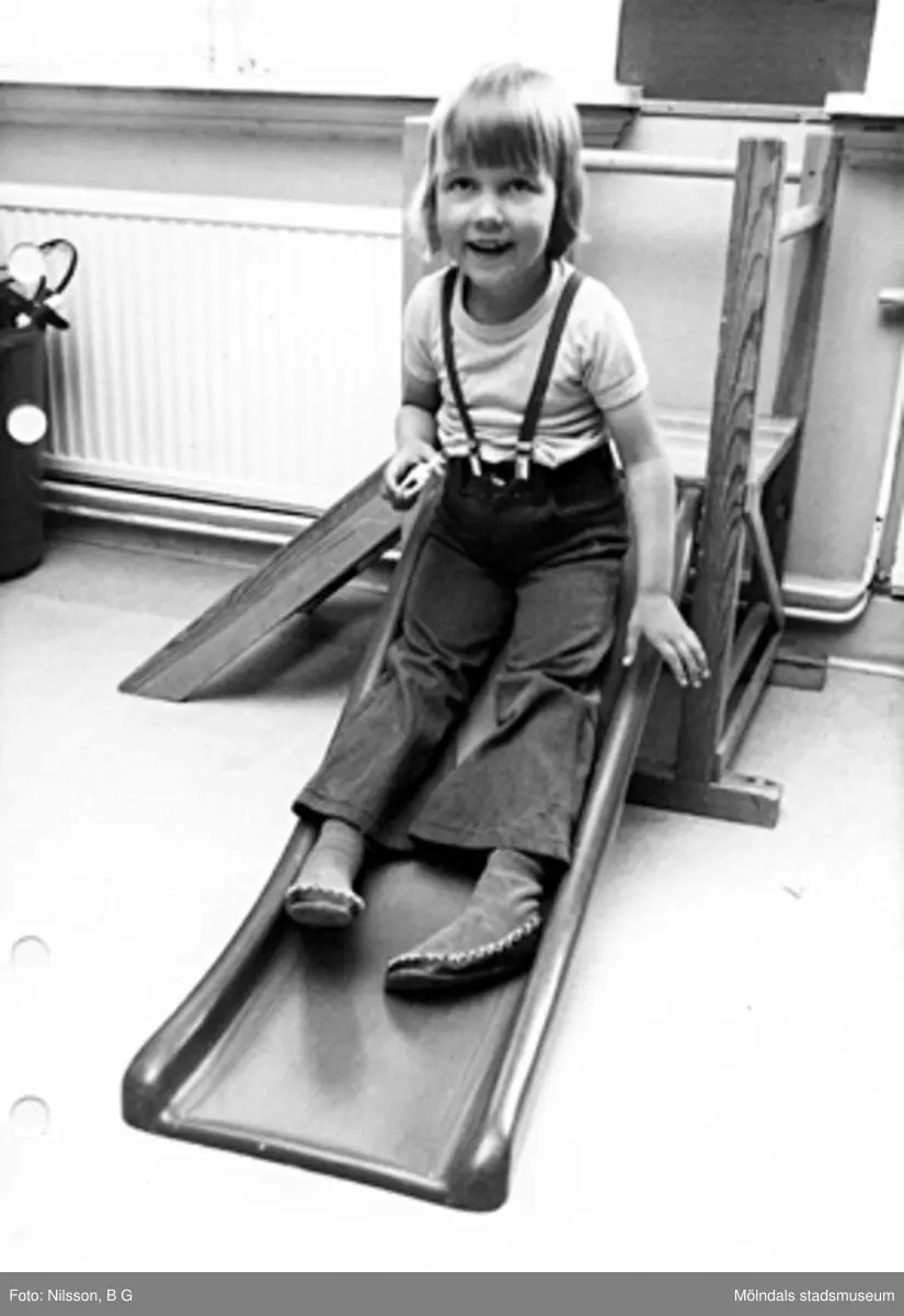 Ett barn som åker i en liten rutschkana inomhus. Holtermanska daghemmet maj 1975.
