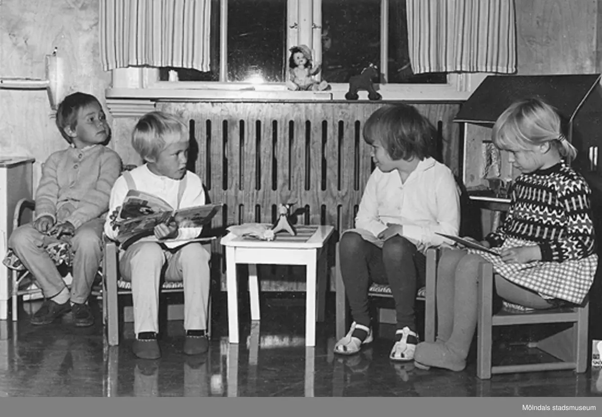 Fyra barn som sitter på barnmöbler vid Holtermanska daghemmet 1953.