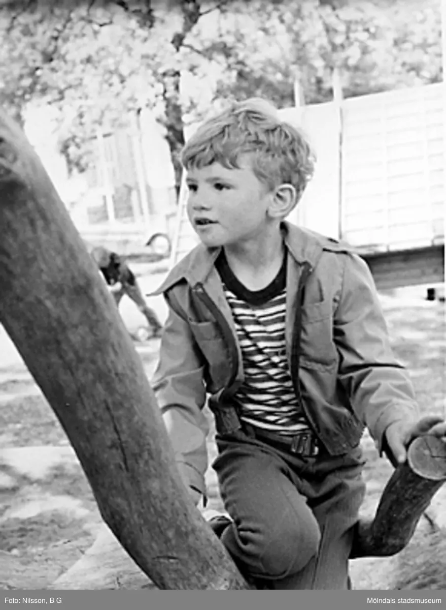 En pojke som sitter i ett klätterträd. Holtermanska daghemmet juni 1973.