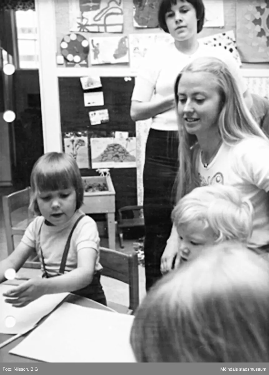 Tre barn som ritar tillsammans med två fröknar. Holtermanska daghemmet maj 1975.