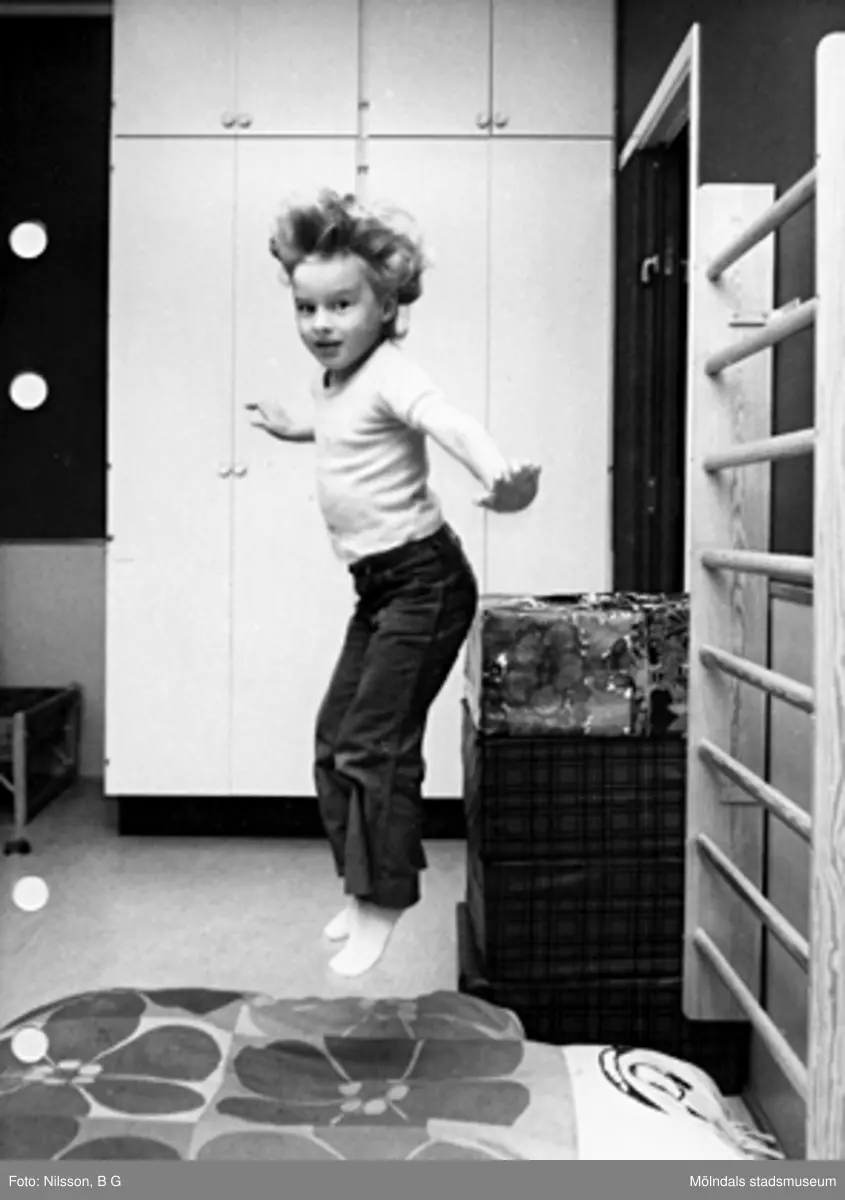 Ett barn som hoppar från en ribbstol. Holtermanska daghemmet maj 1975.